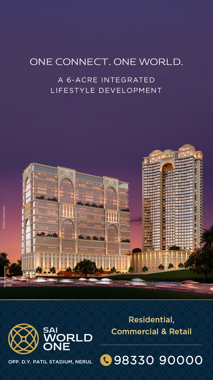 Sai World One Project Address: Opposite D.Y. Patil Stadium, Thane‑Belapur Road, Nerul, Navi Mumbai.
